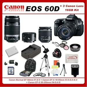 Canon EOS 60D DSLR Camera Kit with 3 Canon lenses: Featuring Canon EF-S 18-55mm f/3.5-5.6 IS II + Canon Normal EF 50mm f/1.8 II + Canon EF-S 55-250mm f/4-5.6 IS, Also Includes: 0.45x High Definition Wide Angle Lens & 2x Telephoto HD Lens, 3 Piece Filter Kit & 4 Piece Macro Lens Kit, Extra LP-E6 Replacement Battery & Travel Charger, 16GB SDHC Memory Card & Reader, Deluxe Backpack, Dedicated Flash and Much More...