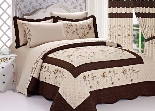 3pc Taupe / Brown High Quality Fully Quilted Embroidery Bedspread Bed Coverlets Cover Set , Queen King