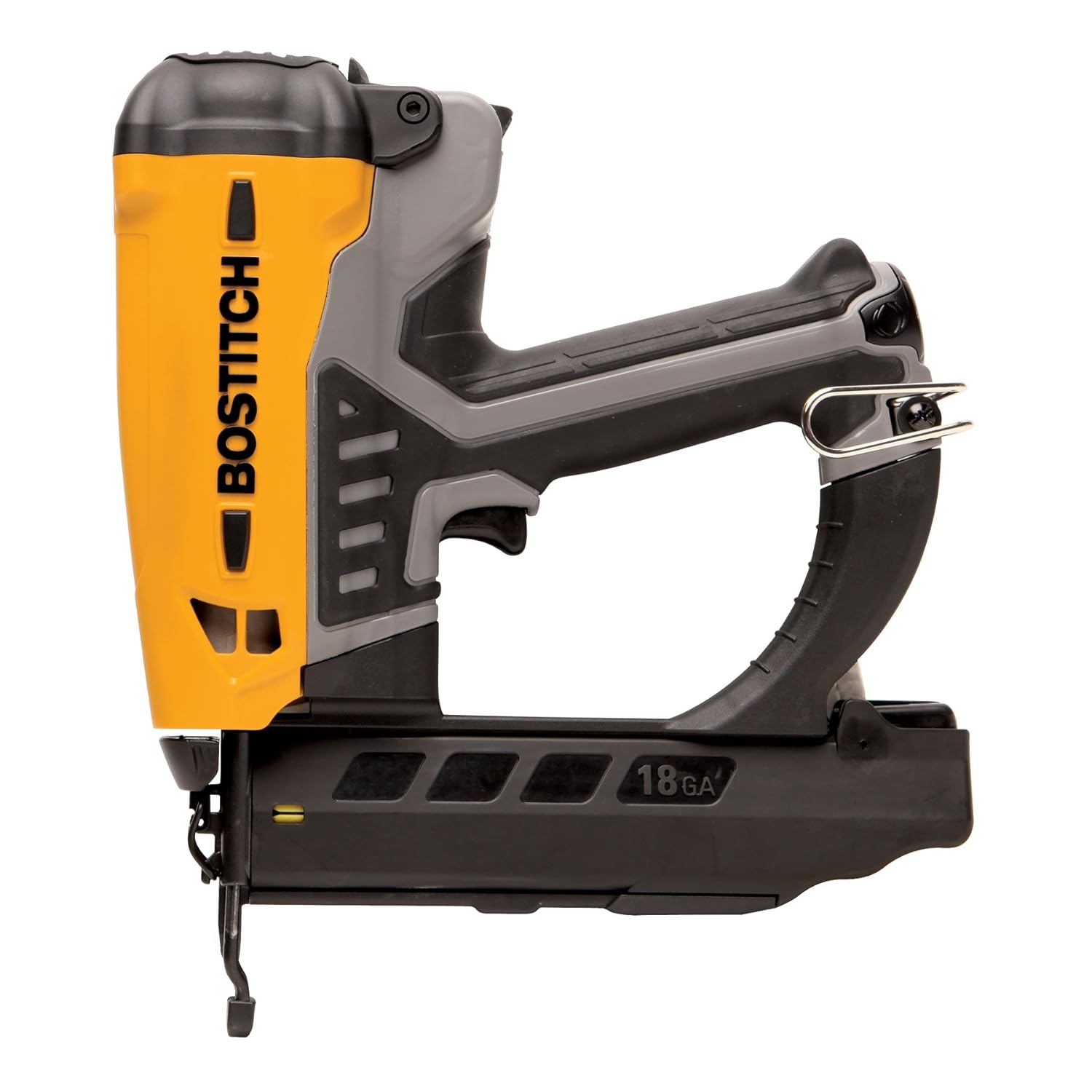 At an easy-to-handle weight of 4 pounds, the Bostitch GBT1850K can be used for long periods of time and in overhead positions with minimum operator fatigue. The over-molded rubber grip offers comfort for all-day projects, and the compact design makes it easy for you to reach into corners and tight spaces. When it's time to take a break, just use the nailer's built-in utility hook to hang it up until you're ready to start again.