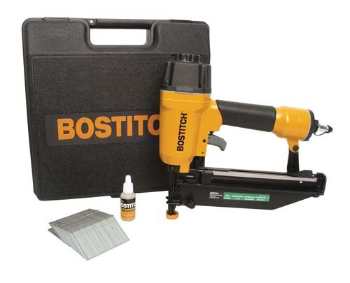 The Bostitch SB1664FN finish nailer drives 1-1/4- to 2-1/2-inch, 16-gauge finish nails and weighs only 4 pounds. Its adjustable depth guide sets nails to desired depths quickly & conveniently. Nails are visible from the top-load magazine, acting as a visual reload indicator. The nailer has a quick-release nose door for fast & easy jam clearing. Its narrow nosepiece positions the tool closer to the work in tight spaces. A tool-free adjustable exhaust directs exhaust away from the user. Kit includes: finish nailer; 1,000-pack of 2-inch finish nails; oil; and convenient carrying case.