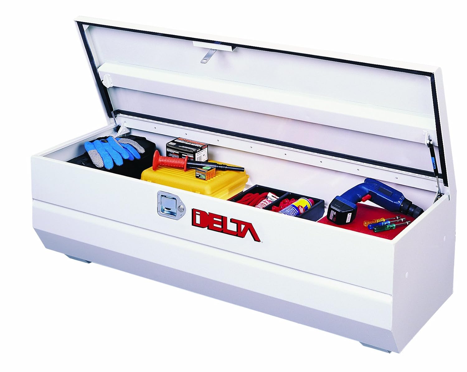 Delta White Full Size Steel Chest for Trucks are made of 16-gauge steel and have reinforced lids for improved strength and security. The tough armor-brite white powder paint finish has superior rust resistance. The features include: a self-rising, reinforced lid has dual gas spring lid lifts for easier access. A recessed hinge allows the lid to fully open when the chest is placed against the bed wall or another object. A 16-gauge steel reinforced construction and heavily-reinforced lid for improved strength and security. A tapered lower front wall will fit better in trucks with all types of bed liners. A 3-compartment sliding tray provides convenient storage for hand tools and small parts. The bottom bolsters raise the chest above standing water. The full weather stripping creates a tight seal against moisture and dust.