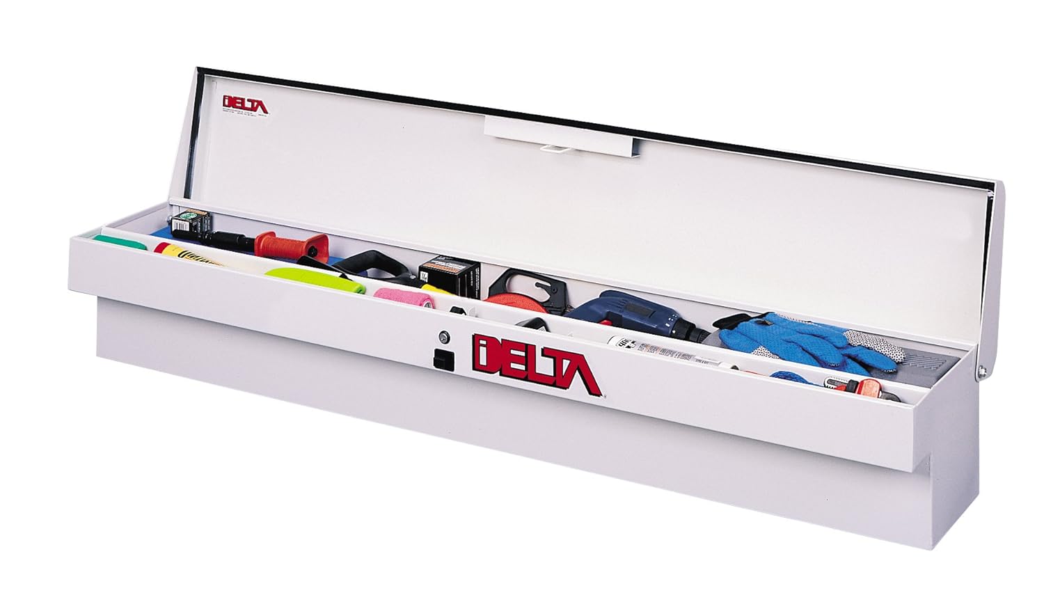 Delta White 48-1/2 inch Long Lid Steel Inner side Truck Box are ideal for storing longer tools and equipment. They mount on top of the side walls, keeping the bed free for storing bulky cargo. The Delta steel inner side can be used with a Delta steel crossover to create a wrap-around storage system. The features include: a heavy-duty steel construction with reinforced lid. Built-in storage compartments on the front for storing hand tools and small parts. The full weather stripping to help seal out moisture and dust. Fully welded seams and formed edges add extra strength and rigidity.