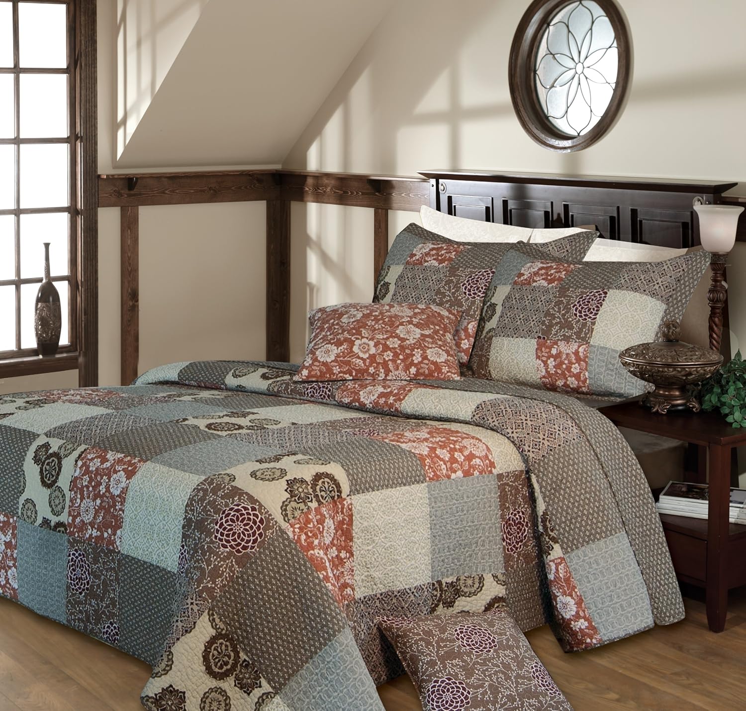 Stylized floral medallions combine with geometric prints featuring crisp, fine lines in the Stella quilted bedding set. Patchwork construction in shades of taupe, sienna, burgundy, aloe and gray. Reverses to a coordinating geometric print. 100% cotton face, back and fill. Prewashed and preshrunk. Bedspread sizes have extra long drop on three sides of the bed. Easy care machine washable cotton. Each set includes 1 quilted bedspread and 2 pillow shams. 1 sham per Twin set. Patchwork Pattern.